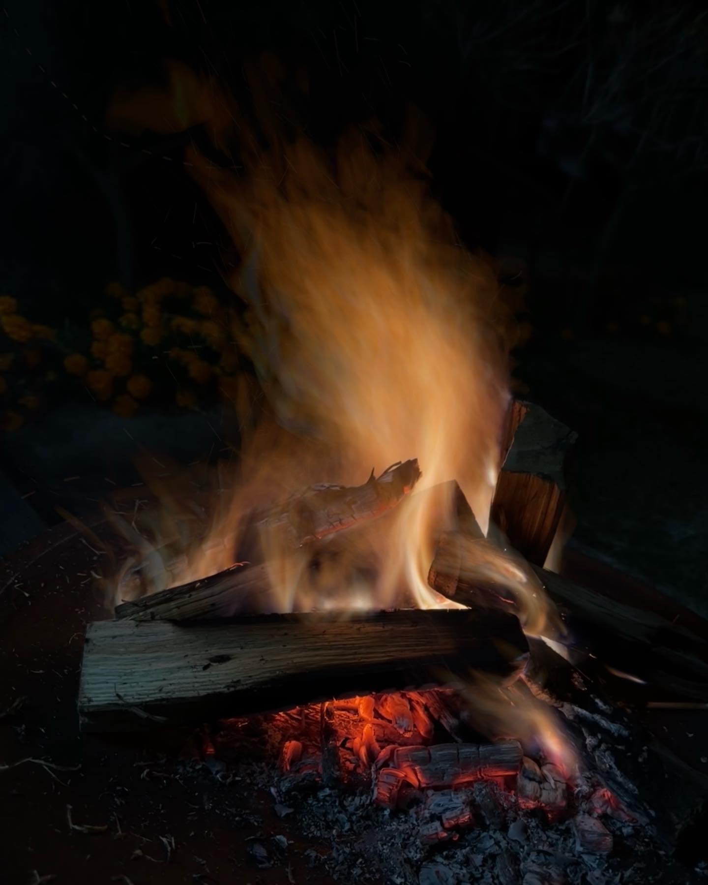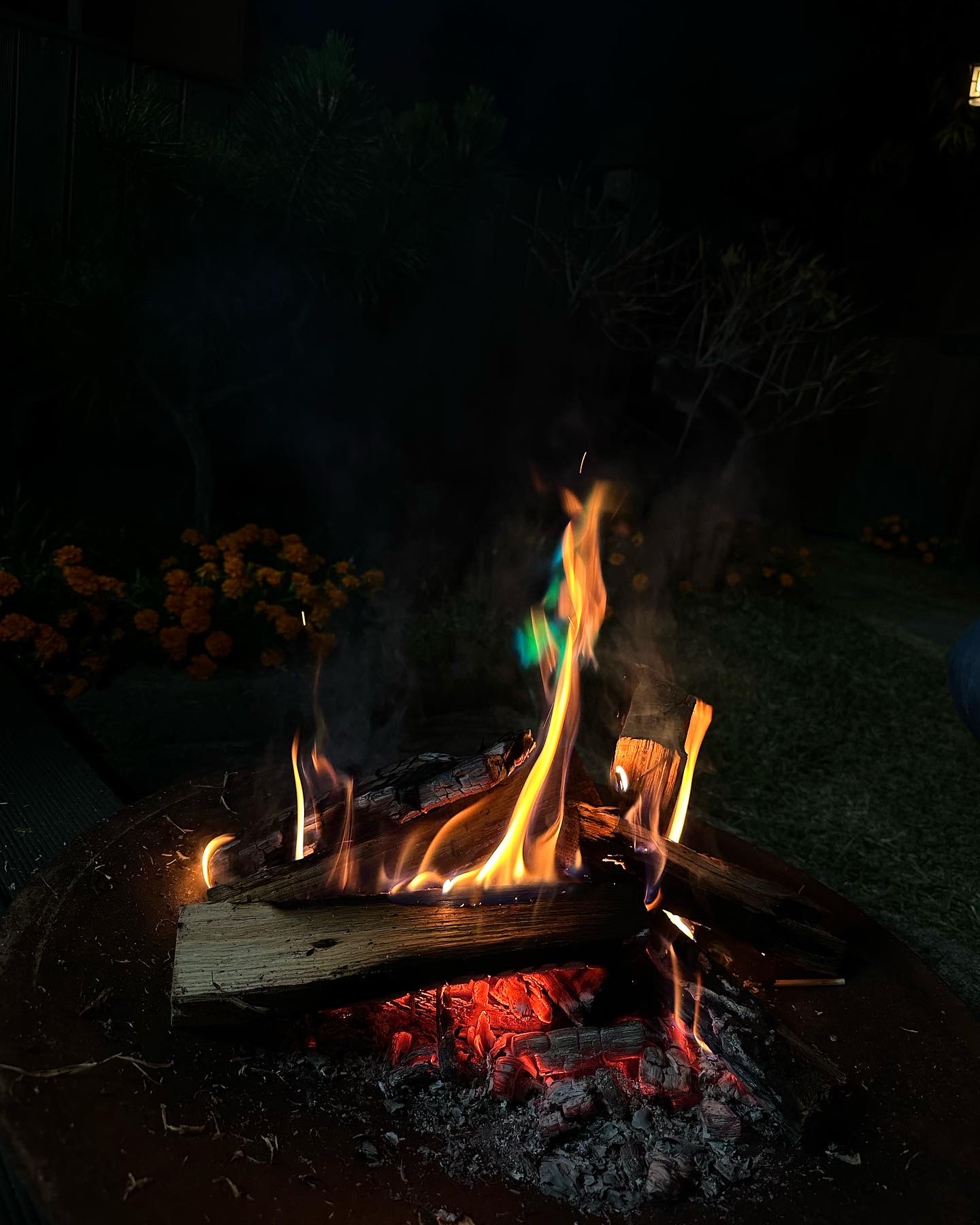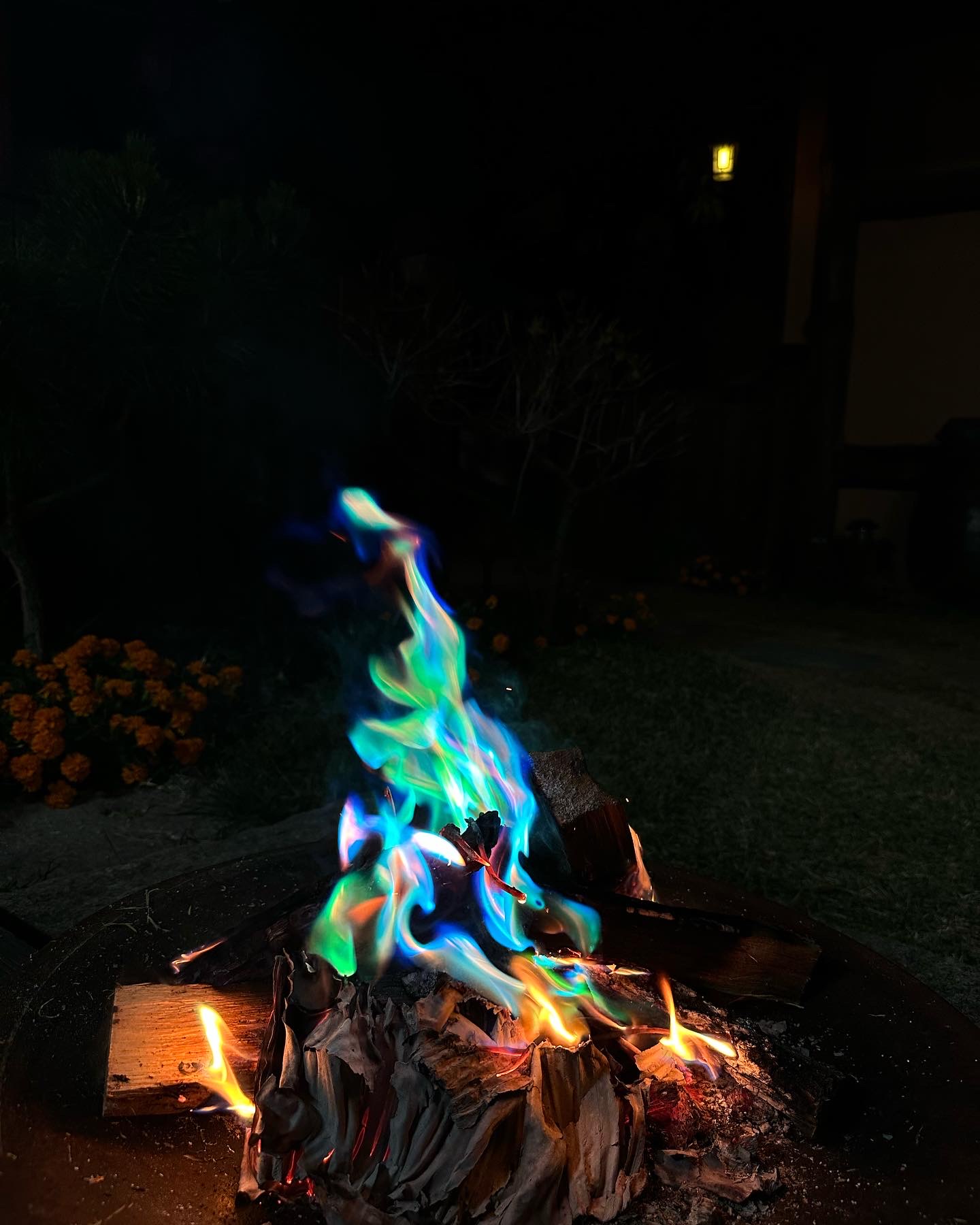펜션에서 불멍이 가능할 것 같지 않았지만 워낙에 단골이어서인지 아니면 알아서 원래 되는지 모르겠지만 고기를 굽고 남은 숯에 불멍을 하기 위한 장작들을 넣었다. 오랜만에 하는 불놀이가 너무 재밌어서 처음부터 끝날 때까지 열심히 불놀이를 했다. 불의 색깔을 바꾼다는 잇템도 가져오셔서 신기한 경험을 했다. 불꽃이 푸른색으로 변했다. @_@