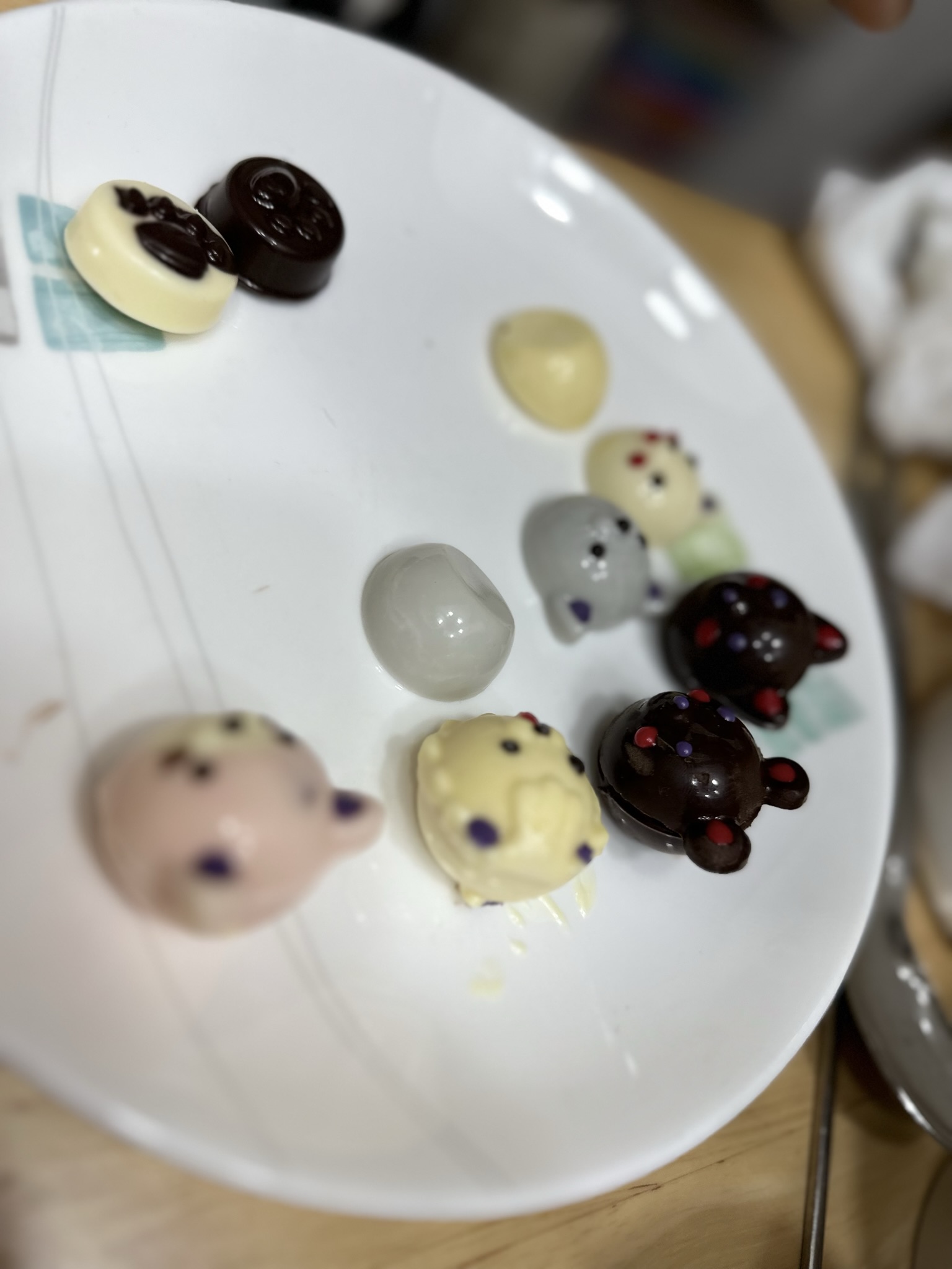 초콜릿을 녹이고 하는데 불이 쓰이다 보니 괜히 민감해져서 살갑게 얘기를 못해주는 것 같다. 위험한 것 앞에서는 목소리가 높아진다. 조금 더 잘 얘기할 수 있었는데.. 그래도 동물 초콜릿은 40 ~ 50 도의 온도에서 녹여 작업하다 보니 그래도 수월한 편이었다.