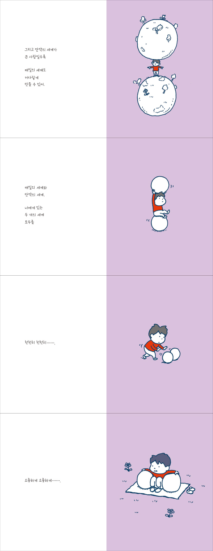 굉장히 심오한 질문이지만, 받아들이는 것은 개인의 몫일 것이다. 어린아이가 느끼는 것과 부모가 느끼는 느낌은 분명 다를 거다. 요시타케 신스케의 책은 늘 그렇다. 자신만의 세계에 대한 생각을 할 수 있게 해 준다.