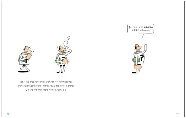 새로운 일은 늘 의도하지 않은 방향으로 흘러가고 당황스러움을 안겨주지만 또한 즐거움이 있다. 늘 같은 패턴 속에 살던 우체부는 새로운 것에 대한 즐거움을 알았던 것이다. 새로운 것에 대해 스트레스만 받지 말고 기대와 살짝 즐거운 긴장도 함께하며 재미난 일이 될 수 있도록 해보자.