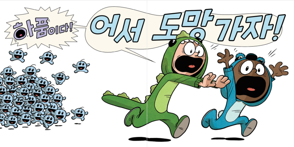 아이들에게 이 책을 읽어주면 너무 공감하지 않을까? 잠자리 친구 하품이, 꾸벅이, 코골이, 졸음이는 내일 열심히 놀기 위해서 나를 쉬게 해주는 멋진 녀석들이라는 것을 아이들이 알아줄지도. 알아도 안 되는 건 안 되는 거니까. 아이들의 독서 욕구는 다른 욕구를 모두 채운 뒤에 발생한다고 하니 늘 늦은 밤에 찾아온다. 책을 읽자면 또 자라고 하는 마음이 약해진다. 어설픈 반복의 연속이다. 아이들이 안 자려고 견디는 것은 엄마 아빠 닮아 그런 거라고 그냥 그렇게 생각하자.