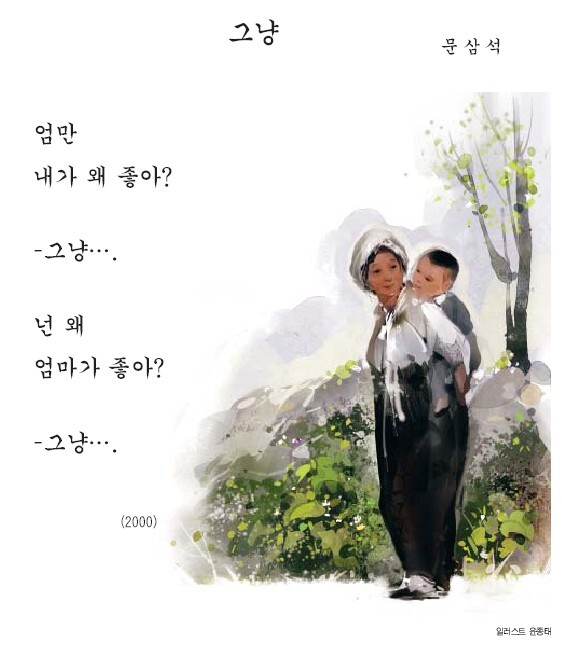우리는 시에서처럼 어떤 질문에 명확하게 설명할 수 없을 때 '그냥'이라는 말을 사용하곤 한다. '그냥'이라는 말은 어떠한 변화가 없음을 나타내는 부사이면서 행동의 의도가 없을 때 쓰이곤 한다. 때로는 그다지 특별하지 않음을 나타날 때에도 쓴다. 무심코 던지는 말이지만 그 뜻의 폭이 넓어서 종종 오해를 받곤 한다.